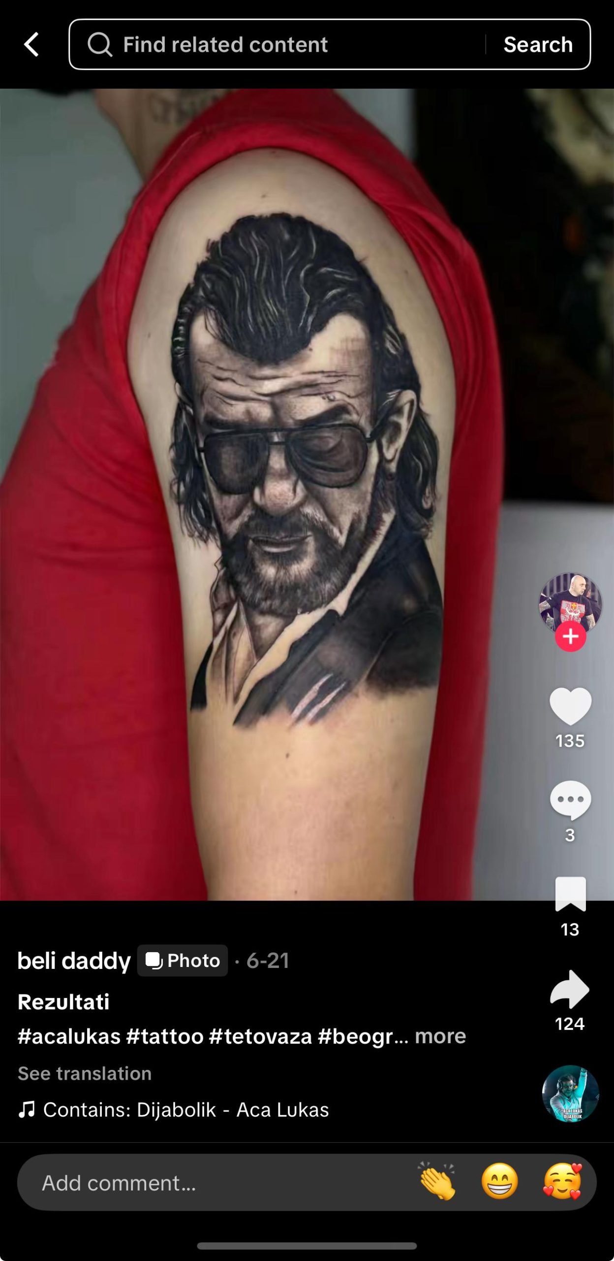 Фан на Аца Лукас ја покажа својата безрезервна посветеност – го истетовира неговиот лик (ФОТО) ФОТО/ТИКТОК Еден од најверните обожаватели на балканската музичка ѕвезда Аца Лукас својата љубов кон пејачот ја овековечи со тетоважа на надлактицата – со ликот на Лукас, изработен во реалистичен стил. Будва на нозе! Аца Лукас направи општ хаос во дискотеката … Продолжи со читање Фан на Аца Лукас ја покажа својата безрезервна посветеност – го истетовира неговиот лик (ФОТО)