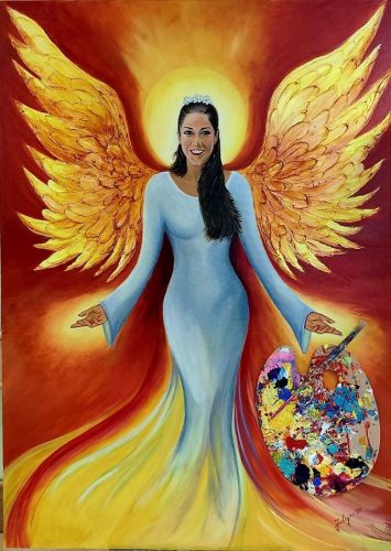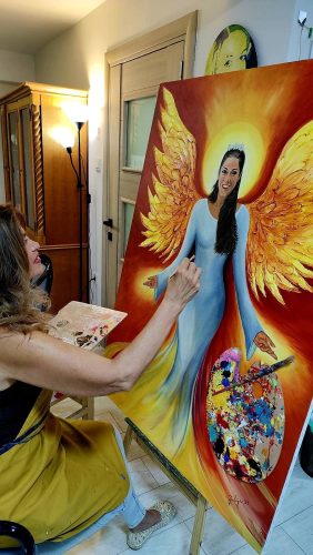Низ деталите на платното – венче од бели цветови, ореол и топло златно-жолто светло – Јулија го претставува ликот на ќерката како небесен ангел. „Така ја видов првпат… кога ми рече: ‘Мама… жива сум’“, споделува таа.