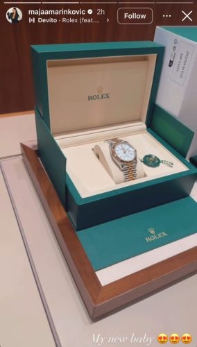 Таа објави сет фотографии од луксузно патување во Порто Монтенегро, во Тиват, каде што уживаше во шопинг и сончев ден покрај море, по што се пофали со новиот златен часовник. Маја во описот на видеото каде го покажува новиот часовник напиша: „Моето ново бебе“.