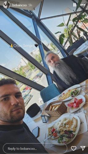 Македонскиот боксерски шампион Бобан Илиоски, познат по својата дисциплина и посветеност во рингот, повторно беше забележан во друштво на својот духовен водич – отец Сергеј. Двајцата се појавија на неколку фотографии и видеа објавени на социјалните мрежи, каде што се гледа како споделуваат момент и во сала и во пријателски разговор за време на оброк.