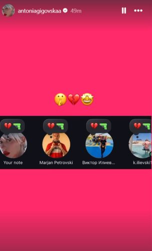 На нејзиното Instagram Стори, Антониа објави клип во кој се гледа како неколку јавни личности, меѓу кои и влијателни македонски инфлуенсери, објавуваат емотикони од скршено срце и пиштол. Но токму она што го привлече вниманието на фановите е тоа што Антониа го репостираше тоа на својот профил, оставајќи ги сите во прашање: