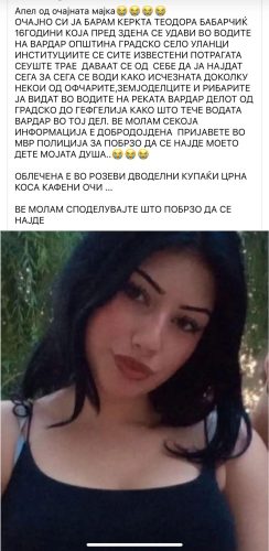 „ОЧАЈНО СИ ЈА БАРАМ ЌЕРКАТА ТЕОДОРА БАБАРЧИЌ, 16 ГОДИНИ, КОЈА ПРЕД ДЕНА СЕ УДАВИ ВО ВОДИТЕ НА ВАРДАР, ОПШТИНА ГРАДСКО, СЕЛО УЛАНЦИ. ИНСТИТУЦИИТЕ СЕ СИТЕ ИЗВЕСТЕНИ, ПОТРАГАТА СЕУШТЕ ТРАЕ…“ – пишува во статусот објавен на социјалните мрежи од страна на нејзината мајка.
