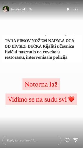 „Тара Симов со нож нападнала татко на поранешно момче! Ријалити учесничка физички нападнала човек во ресторан, интервенирала полицијата“ – се наведува во лажните информации кои Тара ги коментираше со емотикон срце на крајот: