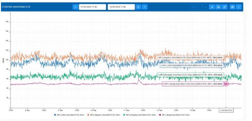 Во периодот од 7 до 14 септември 2025 година, автоматскиот систем за мерење на радијација работеше непречено, при што беа регистрирани податоци од сите 14 мерни точки низ земјата, вклучувајќи ја и станицата во Скопје (МКМП-1).