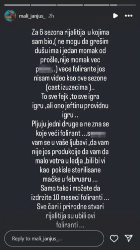 – Во šесте сезони на реални šоуа šто ги имам (не моžам да и замерам на дуšата, има дури и еден деčко од минатата година кој не е деčко туку п*****), никогаš не сум видел поголеми измами. Како оваа сезона (со некои исклуčоcи). Се е лаžно, се е игра, ама ефтина игра… Се плукаат, а не е јасно кој е поголем фејкер… Заебана си во љубовта, нели повеќе производство да ви даде малку ветер во задниот дел тие ќе бидат повеќе како влаžни стерилизирани маčки во февруари? „Тоа е единствениот наčин на кој моžете да ги поднесете фалсификатите… Тие го убиле cелиот šарм и природни неšта на реалните šоуа“, се вели во неговата објава.