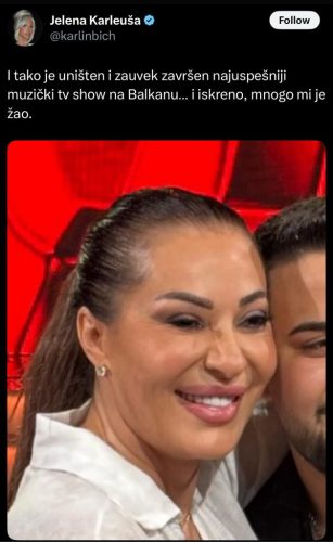 Пејачката Јелена Карлеуша повторно ја вознемири јавноста со објава на својот профил на платформата X, каде што отворено ја прозва Светлана Цеца Ражнатовиќ и остро го прокоментира моменталниот пад на некогаш најгледаното музичко натпреварување „Ѕвездите на Гранд“, кое е сè помалку во фокусот откако Цеца стана дел од жирито.