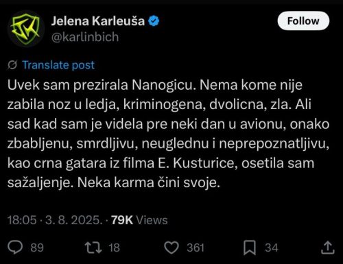 „Секогаш сум ја презирала ‘Наногица’, нема кому не му забила нож во грб, криминогена, дволична, злобна. Но, сега кога ја видов пред некој ден во авион, онака остарена, смрдлива, запуштена и непрепознатлива, како црна бајачка од филм на Емир Кустурица – почувствував сожалување. Нека кармата си ја врши својата работа“, напиша Карлеуша.