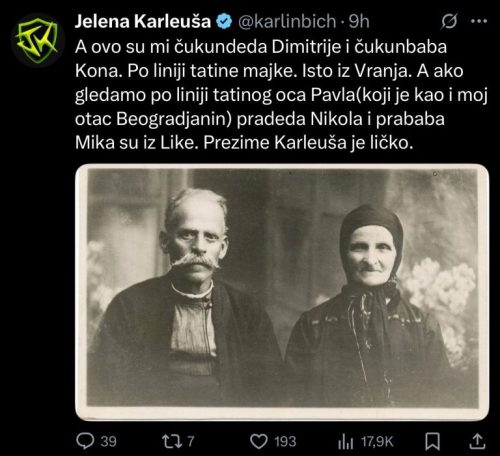 Иако е доста активна на социјалните мрежи, Јелена Карлеуша за првпат објави фотографии од своите предци. Притоа, таа објасни и од каде потекнува нејзиното семејство, но и кои се краевите поврзани со нејзиното презиме.