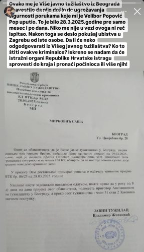 Мирковиќ на својот Инстаграм профил објави документ од обвинителството во кој стои дека на 28 март 2025 година, институцијата заклучила дека не постои закана по неговата безбедност, и покрај добиените заканувачки пораки од страна на Поповиќ.