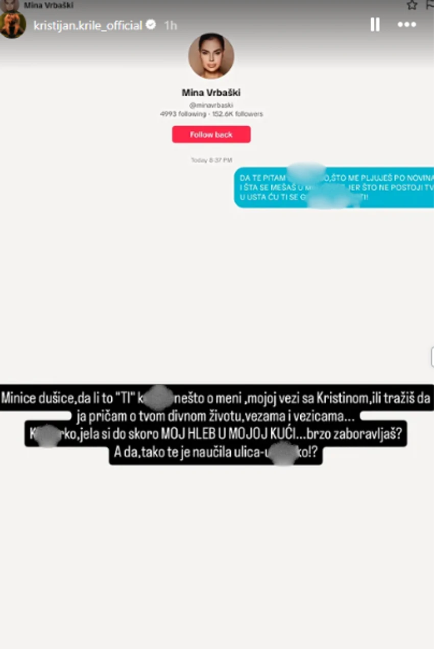 – Да те прашам, смет**рко и курво, зошто се мешаш во мојот живот и зошто ме оцрнуваш по весници? Ќе ти ја разбивам таа валкана уста. Минице, душо, дали ти тоа нешто се дереш за мене, за мојата врска со Кристина, или сакаш јас да прозборам за твојот „сјаен“ живот, врски и авантурки? Курво, до скоро јадеше леб кај мене дома, толку брзо забораваш? А да, така те научи улицата – напиша Кристијан на Инстаграм.