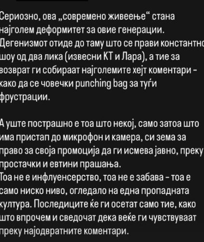 Тоа не е инфлуенсерство, тоа не е забава – тоа е едно ниско ниво, огледало на една пропадната култура. Последиците ќе ги осетат само тие, како што броеви им сведочат дека веќе ги чувствуваат преку најодвратните коментари.“