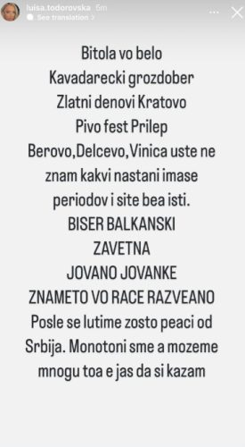 Познатата пејачка Марија Луиса јавно проговори за состојбата на македонската естрада – и тоа без влакна на јазикот! Во последната објава на нејзиниот Instagram, таа упати сериозна критика кон домашната сцена, посочувајќи дека македонските настапи и пејачи станаа монотони, што – според неа – е една од причините зошто сѐ почесто на фестивалите настапуваат српски музички имиња.