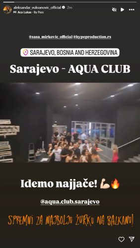 Александар Вуксановиќ, познат под уметничкото име Аца Лукас, продолжува со низата успешни настапи. Вечерва музичката ѕвезда настапува во прочуениот клуб „Аква“ во Сараево. Дека вечерешниот настап ќе биде повеќе од успешен, сведочи фактот што пред клубот има маса луѓе кои чекаат да влезат. Не се знае точниот број на оние кои веќе се внатре во ходникот.