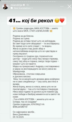 Една од нашите најпопуларни инфлуенсерки, Миа Костова денес го прославува својот 41 роденден. Нејзиниот Инстаграм изгледа како дигитална честитка – исполнета со љубов, моден стил и искрени желби од сите страни.