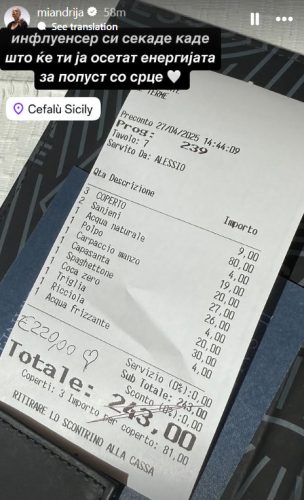 Наšата популарна инфлуенсерка Миа Костова моментално уžива на патување во волšебната Сиcилија, заедно со Тијана и синот Андрија. Како и секогаš, Миа не ги изостави своите следбениcи – преку внимателно избрани објави и репортаžи, ни долови дел од магијата на ова прекрасно место.