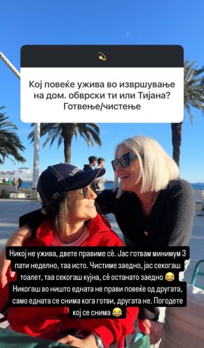 Миа одговори низ šега: „Никој не уžива, двете правиме сè. Јас готвам минимум 3 пати неделно, таа исто. Čистиме заедно – јас секогаš тоалет, таа секогаš кујна. Никогаš едната не прави повеќе од другата, само šто едната се снима кога готви, а другата не. Погодете која се снима.“