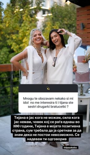 Едно од праšањата гласеšе: „Многу те обоžавам, некако си ми идол, но ме интересира – ти и Тијана сте сестри, другарки или братуčетки?“