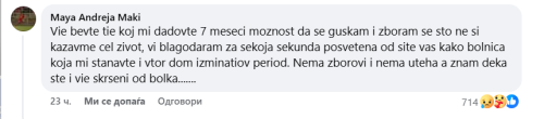 „Вие бевте тие кои ми дадовте 7 месеци можност да се гушкам и зборувам сѐ што не си кажавме цел живот, ви благодарам за секоја секунда посветена од сите вас како болница која ми станавте и втор дом изминатиов период. Нема зборови и нема утеха, а знам дека сте и вие скршени од болка“ коментираше таа на објавата од болницата.