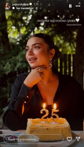 На Instagram стори, Лина објави прекрасен портрет од сестра ѝ, каде таа седи пред роденденска торта со бројките 25, облечена во елегантна црна кошула, со насмевка што зрачи спокојство и среќа. Над фотографијата стои топлата и кратка, но моќна порака:„Мојата најголема среќа!“