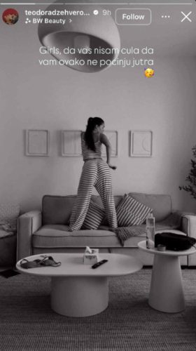 Овој пат, Теодора се снимаше во својот стан, покажувајќи завидни танцови вештини и уште еднаш докажувајќи зошто важи за една од најатрактивните пејачки на домашната сцена. Во еден момент се искачи на креветот и почна заводливо да ги ниша колковите, што предизвика воодушевување кај нејзините обожаватели.