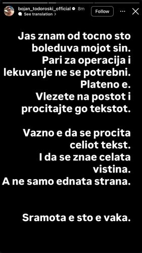„Да правиш жртва од себе, а да блокираш – не даваш пристап ниту на таткото, ниту на фамилијата – да дојдат, да го видат, да помогнат – НЕ. А да се правиш паметен и да бараш пари од луѓе за нешто нереално, за себе – тоа е срамота. Повторувам: операцијата е направена, лекувањето е платено.“