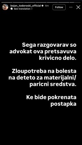 Во последната објава, Тодороски информираше и дека се консултирал со адвокат и дека планира да преземе правни чекори. „Сега разговарав со адвокат. Ова претставува кривично дело – злоупотреба на болеста на детето за материјални, парични средства. Ќе биде покрената постапка.“