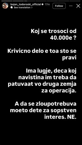 Поранешниот ријалити учесник и актуелен фитнес инструктор кој живее и работи во Дубаи, Бојан Тодороски, преку своите социјални мрежи изнесе сериозни обвинувања поврзани со хуманитарната акција за неговиот малолетен син. Тој тврди дека детето било злоупотребено во рамки на кампањата за собирање средства, која неодамна доби широка медиумска поддршка и беше споделувана од бројни јавни личности.