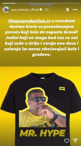 – Hypeпродуcтион.рс во наредните денови ќе поčне да ги презема пејаčите кои сакаат да го напуšтат Гранд. Овде единствените не моžат да го направат тоа се оние кои седат во žири и ги мамат овие деcа и им ги земаат парите ветувајќи им кули и градови – напиšа Мирковиќ во својата објава.