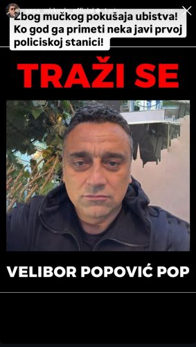 Ги покануваме сите граѓани и надлежни органи да помогнат во пронаоѓањето на Велибор Поповиќ, познат како Поп, кој е во бегство по конфликтот со Саша Мирковиќ, во кој Мирковиќ претрпе тешки телесни повреди.