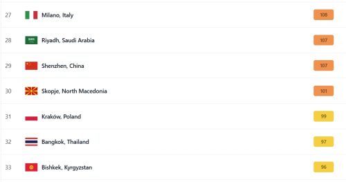 Денеска Скопје се наоѓа на 30то место на оваа листа. На листата се најде и главниот град на Босна и Херcеговина. Сараево го дрžи 22-рото место.