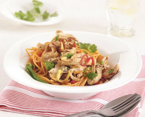 Šпагетите со пилеšко и зеленčук се слуžат топли, со додатни сосови по žелба.