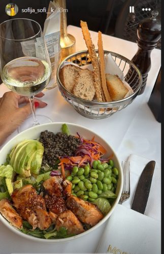 Втората објава е уште повеќе „инста-совршена“ – гурмански момент од луксузен ресторан: чаша бело вино, гурманска здрава чинија со печен лосос, авокадо, едамаме, црна леќа и микс салата, плус кошничка со селектирани видови леб.