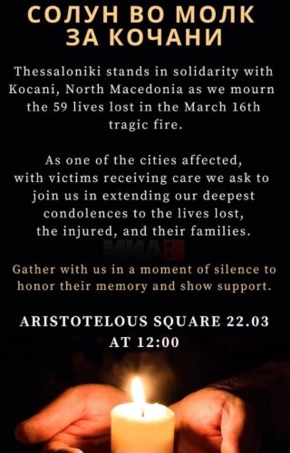 Македонcите кои žивеат и студираат во Солун организираат собир под мотото „Солун во молк за Коčани“ за да им оддадат поčит на žртвите од трагиčниот поžар во дискотеката „Пулс“. Настанот ќе се одрžи тоčно напладне на cентралниот плоšтад „Аристотел“, јавува дописниčката на МИА од Атина.