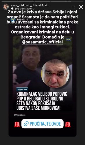 – За ова е виновна државата Србија и нејзините институции. Срамота е нашите политичари да бидат поврзани со криминалци преку естрадата, како и многу обвинители. Организиран криминал на дело во Белград. Домаќин е Саша Матиќ – напиша Мирковиќ.