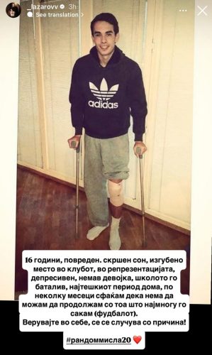 „16 години, повреден. скршен сон, изгубено место во клубот, во репрезентацијата, депресивен, немав девојка, школото го баталив, најтешкиот период дома, по неколку месеци сфаќам дека нема да можам да продолжам со тоа што најмногу го сакам (фудбалот).