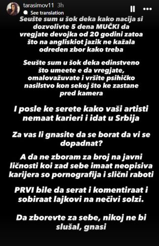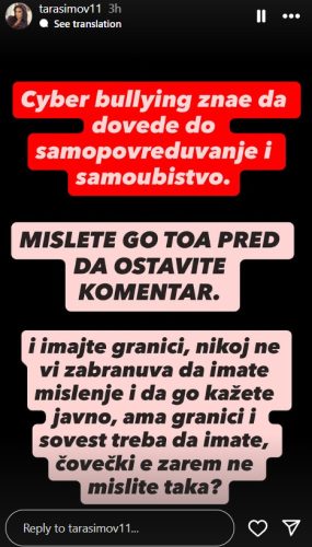Тара Симов јавно застана во одбрана на инфлуенсерката и модел Елена Ѓорговска, која последниве денови е мета на остри и навредливи коментари од јавноста поради нејзина контроверзна изјава. На својот Instagram профил, Тара преку неколку сториња им упати остра порака на сите што, како што таа вели, „ја линчуваат девојката без причина“.