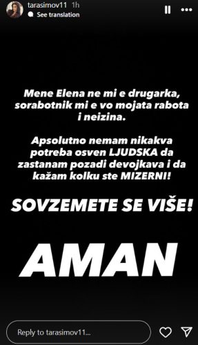 „Мене Елена не ми е другарка, соработник ми е во мојата работа и нејзина. Апсолутно немам никаква потреба освен ЛЈУДСКА да застанам позади девојкава и да кажам колку сте МИЗЕРНИ!“ – напиша Тара, потенцирајќи дека мотивот за нејзиниот јавен став не е личен интерес, туку чиста човечност.