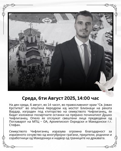 Посмртните останки ќе бидат изложеби во 14.00 часот во храмот „Свети Јован Крстител“ во Аеродром каде што ктитор е семејството Чифлиганец, а опелото ќе го предводи поглаварот на МПЦ-ОА, владиката Стефан.