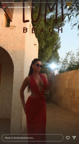 Имено, Теодора на својот профил на Инстаграм сподели фотографии на кои позира во впечатлива, огнено црвена фустан.